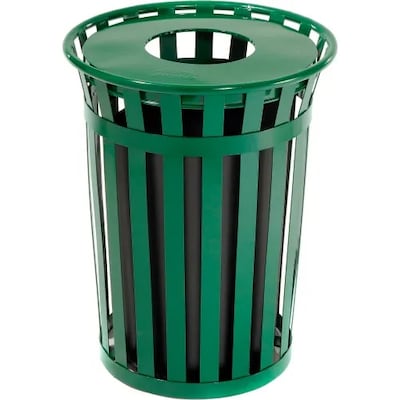 The round 36-gallon Global Industrial™ Outdoor Steel Slat Recycling Trash Can gives you a large capacity for rubbish with design and construction details that provide resistance to the elements, graffiti, and vandalism. The flat-bar steel slats are fully welded and treated with a corrosion-resistant green polyester powder coat finish that will hold up against harsh summer and winter weather. Included with the trash can is a flat lid with hole for trash that is secured to the frame with a cable to prevent loss or theft, and a removeable interior high-density polyurethane plastic liner that holds the trash or provides a way to install and hold a trash bag.