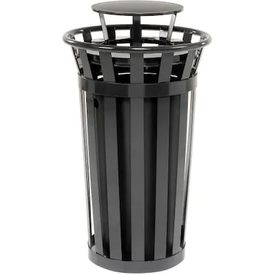 The 24-gallon Global Industrial™ Outdoor Black Steel-Slatted Trash Can with Rain Bonnet Lid gives you a large capacity for rubbish with design and construction details that provide resistance to the elements, graffiti, and vandalism. The flat-bar steel slats are fully welded and treated with a polyester powder coat finish to create a durable receptacle that will hold up against harsh summer and winter weather.