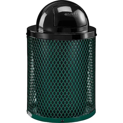 The round 36-gallon Global Industrial™ Outdoor Diamond-Steel Trash Can with Domed Lid gives you high capacity for rubbish with design and construction details that provide resistance to the elements, graffiti, and vandalism. The lid & base are made of steel and treated with a corrosion-resistant green powder coat finish and the expanded metal steel sides have a glossy green fade- & corrosion-resistant thermoplastic coating that will hold up against harsh summer and winter weather. The trash can features a domed lid outfitted with a self-closing door that hides waste from view and keeps out rain & snow, while allowing easy access to dispose of trash. The lid is secured to the frame with a cable to prevent loss or theft. A removeable interior plastic liner that holds the trash or provides a way to install and hold a trash bag is also included.