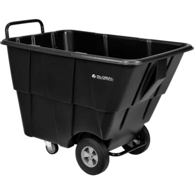 The black, 1/2 cu. yd. Global Industrial™ Standard-Duty Plastic Tilt Truck helps workers transport trash, laundry & linens, and other bulk items with ease. Its large push handle, 1/2 cu. yd. hopper, 850 lb. capacity, and integrated tilt handle makes transporting and dumping heavy loads simple. The wide tubular steel push handle, 9" rear load wheels & 4" swivel casters provide maximum maneuverability. Made from 1-piece seamless rotational molded black polyethylene, the dump body cleans easily, won't dent, corrode, or absorb moisture, and is leak-proof. Limited 1-Year Warranty.