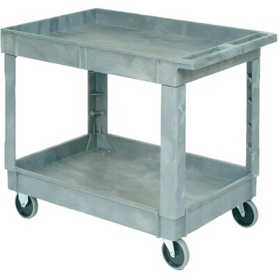 From tools & supplies, to equipment of all varieties, this Global Industrial™ Utility Cart features two shelves & large 5" casters and is perfect for any indoor application where a lot of items need to be safely moved from one location to another. The utility cart has a lightweight design and rugged construction for strength, durability, and a long service life. It is made of a durable, easy-to-clean structural molded foam plastic that won't rust, dent, peel, or chip, so it is virtually maintenance-free—making it perfect for industrial, medical, or foodservice loads. Does not meet FDA standards Limited 1-Year Warranty.