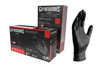 The Ammex Gloveworks black nitrile powder-free industrial glove will get as down and dirty as you need. It's the disposable glove that won't quit on you. This premium industrial-grade nitrile glove is the perfect combination of strength, dexterity, and comfort. The glove is more than 50% thicker than standard nitrile gloves, which adds durability, and that means fewer glove changes over the course of a shift. Nitrile has three times the puncture resistance of latex, and at 5-mil thickness in the palm with 6-mil fingertips, the glove holds up when working with tools and machinery. This glove offers excellent protection against a long list of common and specialty chemicals and is nearly as elastic as latex, so it conforms to your hand to deliver comfort, a great fit, and a high level of tactile sensitivity. The micro-roughened surface and textured fingertips give the glove a dependable grip. A polymer coating makes it easy to put on the glove as well as to take it off, and since it's powder-free, there's no residue to damage a perfect finish or an adhesive bond. This glove works for automotive, industrial, janitorial, sanitation, food service, and safety applications. The black color hides dirt, grease, and grime to help maintain a clean, professional look. The glove is made from component materials that comply with FDA regulations for food contact. Also suitable for countless uses around the house, from cleaning to painting to repairs. For the pro who takes on the toughest jobs, the Ammex Gloveworks black nitrile powder- and latex-free industrial glove is a perfect fit.
