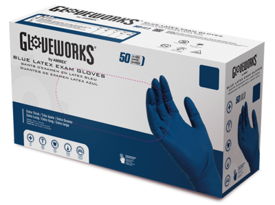 Gloveworks Exam Blue Latex Gloves feature an extended cuff—longer than a standard glove—to offer greater protection over your forearm and wrist from bodily fluids, bloodborne pathogens, and contaminants.