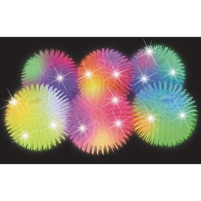 Light Up Soft Puffer Balls in assorted colors are sure to turn an ordinary playtime into all kinds of fun! These funky light toys have brilliant flashing LEDs inside and are impact activated. Light Up Puffer Balls are large, soft, and squishy with a loop for easy holding and flinging. Sure to be a big favorite! To activate, simply toss one of the balls at any hard surface and watch the colors flash like crazy! LED lights will turn off automatically after a few seconds. Soft Assorted Light Up Puffer Balls come ready to use and are equipped with non-replaceable batteries.