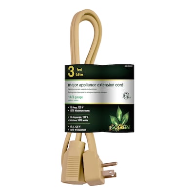 Make sure any cord can reach the plug with a 14/3 appliance cord from GoGreen Power. It can be used with a number of different appliances, such as an air conditioner, washer and dryer, dishwasher or a fridge. The beige extension cord features a grounded three prong head.