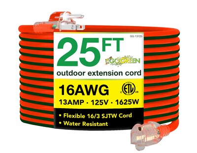 The GoGreen Power Heavy-Duty Extension Cord is ideal for multiple applications around your home's exterior and garage. It resists moisture, abrasion and exposure to sunlight. The length of the outdoor extension cord allows you to cover a large area without the need for continuous stops to remove and replug. Use it to power your electric tools, lawn mower, to operate your generator and to provide lighting and music while entertaining. The cord is ETL listed and features a light on the end that shines when it's in use.