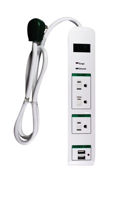 Whoever said good things come in small packages must have been talking about the 3-Outlet Surge Protector w/USB by GoGreen Power®. Designed for peak performance for users on the go, the 3-Outlet Surge Protector w/USB by GoGreen protects your electronics while giving you that much-needed place to park your phone, tablet, or other USB devices for charging. ??The GoGreen 3-Outlet Surge Protector w/USB sports a 15 amp, 1875 watt circuit breaker providing an incredible 1,200 joules of simultaneous protection for two standard outlets, one large adapter, and two USB ports at once. The compact design includes an indicator light verifying you have active protection at all times, and industry standard EMI/RFI shielding means you'll never have to wonder about performance or safety. ?With a right-angle plug and a three-foot cord, the GoGreen 3-Outlet Surge Protector w/USB puts power and protection right at your fingertips. And with the environmentally-friendly design of all GoGreen products, you can focus on the task at hand knowing your computers, appliances, and other electronic devices are safe and sound.