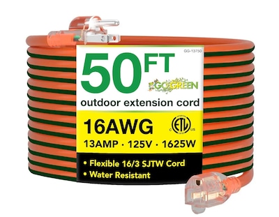 The GoGreen Power Heavy-Duty Extension Cord is ideal for multiple applications around your home's exterior and garage. It resists moisture, abrasion and exposure to sunlight. The length of the outdoor extension cord allows you to cover a large area without the need for continuous stops to remove and replug. Use it to power your electric tools, lawn mower, to operate your generator and to provide lighting and music while entertaining. The cord is ETL listed and features a light on the end that shines when it's in use.