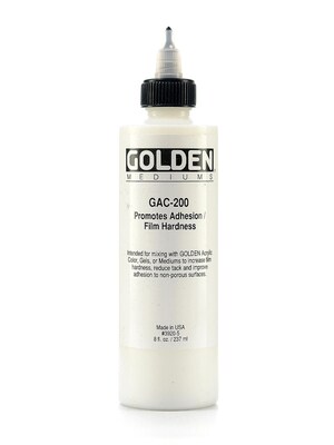 GAC 200 is a liquid acrylic polymer emulsion that is the hardest and least flexible of Golden acrylics. Useful for increasing film hardness and reducing tack. Increases adhesion to non-porous surfaces, such as glass. Used in its pure form, it is limited to applications on non-flexible supports. Generally, GAC-200 should make up a maximum of 33% of the entire paint mixture. Dries with high gloss and excellent film clarity.