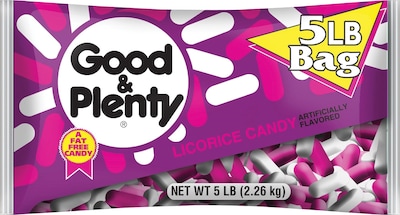 Treat your friends and family to five plentiful pounds of big licorice candy taste! GOOD & PLENTY Candy is great for snacking, sharing, and celebrating special occasions. Its pink and white shells also make it the perfect addition to bridal showers, baby showers, birthday parties, and family movie nights.