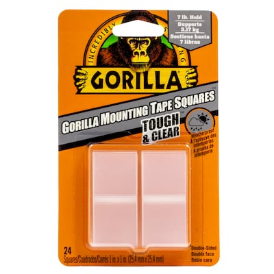 Gorilla Tough & Clear Mounting Tape Squares are clear, double-sided, 1 inch squares of tape that mount in an instant for a permanent, weatherproof bond. These crystal clear squares won't yellow over time, and hold up to 7 pounds! Gorilla Tough & Clear Mounting Tape Squares are perfect for indoor and outdoor projects and stick to smooth and rough surfaces. Completing DIY projects is easy with these pre-cut, double-sided squares. Mount, build and repair!