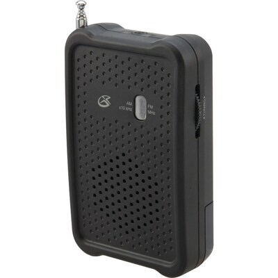 GPX® Portable radio contains a built-in AM antenna, FM antenna, a built-in speaker and a set of stereo earbud headphones. Radio requires 2 AAA batteries to operate.
