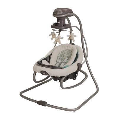 The Graco DuetSoothe Swing and Rocker features an ingenious seat that doubles as a portable rocker, giving you the flexibility to move around the house while keeping baby cozy and close by. In swing mode, 3 swinging directions and 6 speeds allow you to customize the swing to baby's preferences. With additional features including 2-speed vibration, an overhead toy mobile, and soothing songs and sounds, the Graco DuetSoothe Swing and Rocker gives you even more options to keep baby content.