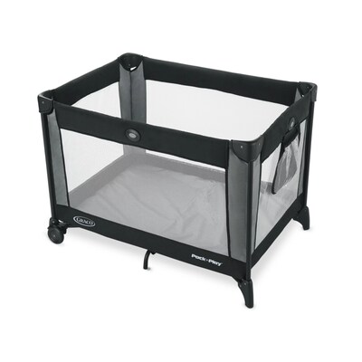 Make sure your little one is comfortable no matter where you go with the Graco Pack 'n Play Playard. It's perfect for travel with folding feet and wheels, allowing a 20% more compact fold, plus a durable and sturdy frame that can stand up to lots of on-the-go use. The playpen's signature Graco push-button fold allows you to break it down quickly and without hassle, and it fits easily into a convenient carrying bag for no-fuss travel or storage. At home or away, baby will be kept comfy and cozy.