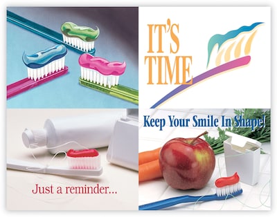 Attention-getting postcard captures your patients attention. The back of the postcard is blank so you can add a personalized message, using your own Laser Printer. Uncoated stock, perforated sheets. Four cards to an 8-1/2" x 11" sheet. 100 cards. Detached size: 4-1/4" x 5-1/2".