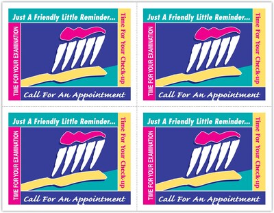 Attention-getting postcard captures your patients attention. The back of the postcard is blank so you can add a personalized message, using your own Laser Printer. Uncoated stock, perforated sheets. Four cards to an 8-1/2" x 11" sheet. 100 cards. Detached size: 4-1/4" x 5-1/2".