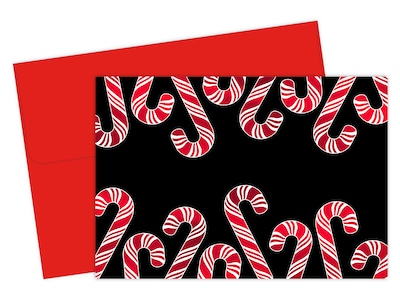 - Card features a 75 lb. cover and comes in black with red foil candy cane print and red envelope