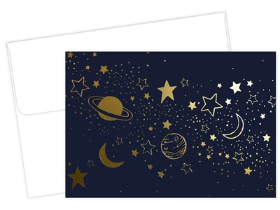 Express your gratitude to friends, coworkers, or associates with this elegant Great Papers! Cosmic Night notecard. The pack contains 50 cards and 50 envelopes, providing an ample amount for your needs. This Great Papers! Cosmic Night notecard features 65 lb. paperweight for durability and high-quality feel, which helps prevent bending and unnecessary folding. The gold print catches the eye, and the blank space offers a place where the text can be easily visible.