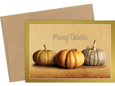 Express your gratitude to friends, coworkers, or associates with this elegant thank-you card. Included are 50 cards and 50 envelopes, providing an ample amount for your needs. This Great Papers! Fall Pumpkins thank-you card is made with durable cover stock, which helps prevent bending and unnecessary folding, and features a blank interior to write a customized thanks to each recipient.