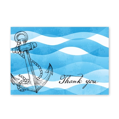 Make a splash with the Ocean Nautical Thank cards. Showcasing beautiful blue waves, an anchor in the lower-left corner, and a fun, wavy "Thank you" in the bottom right, these cards are ideal for ocean lovers and nautical themes.