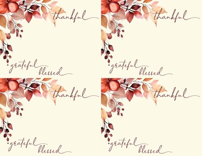 Celebrate the season of gratitude with these festive fall-themed postcards. Featuring rich autumn florals and the heartfelt message “Thankful, Grateful, Blessed,” each sheet includes four perforated cards perfect for Thanksgiving gatherings, seasonal invitations, or thoughtful notes. The warm tones and classic script create an inviting backdrop for your custom message.