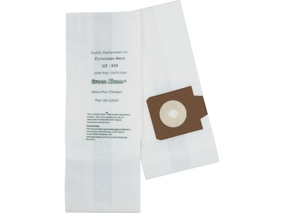 The Green Klean replacement vacuum bag for Kent Euroclean UZ930, UZ930s, GD930, DP9000, Z990, Z970, Pullman Holt B600900, and Viper MB39CV Mamba vacuums uses high-quality filter media, including a meltblown inner liner, in order to achieve filtration efficiencies up to 99.9%. Designed specifically for commercial use, the bag is equal to, or exceeds, the OEM quality. Better filtration means cleaner air, less dusting, longer secondary filter life, at considerable savings.