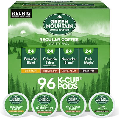 Offer a yummy selection of drinks to family members, employees or clients with this variety pack of regular coffee pods. Included in this pack are Breakfast Blend, Dark Magic, French Roast and Vermont Country Blend coffee pods. These Keurig K-Cup Green Mountain Coffee Roasters Regular coffee pods come in an 96-pack to keep waiting rooms and office spaces stocked.
