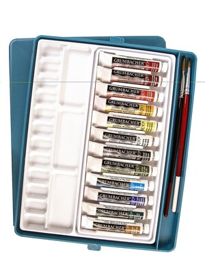Portable watercolor set for field or studio. Contains one .25 oz. (7.5 ml) tube of 12 Academy watercolors: burnt sienna, Chinese white, alizarin crimson, cadmium yellow pale hue, cadmium yellow deep hue, cadmium red light hue, sap green, viridian, thalo blue, Payne's gray, yellow ochre hue, ultramarine blue; one red sable round detail brush; one flat wash brush; one palette with 12 color wells, 3 mixing wells and 1 large wash area; instruction booklet; and a portable carrying case.