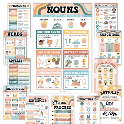 The English language is complex! And learning parts of speech can leave kids feeling overwhelmed. Luckily, our English posters for classroom walls simplify confusing English concepts while capturing (and keeping) kids' attention with engaging visuals—so students look forward to learning! This educational wall poster set includes 12 different 11x17" teaching posters—containing everything needed to help students identify parts of speech. These English teacher's posters are also easy to read and understand, making them the perfect visual aid for kids to reference.