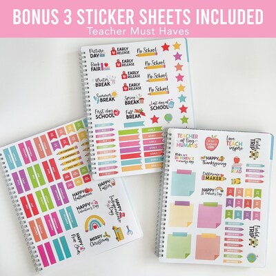 Looking to take control of your hectic teaching schedule" Then get organized in style with our teachers planner! You'll receive an 8x10 inch teacher planner with 12 undated monthly sections, each with space for five weekly plans per month. Plus, you'll get 3 sticker sheets, 1 substitute sheet, 1 field trip planner, 2 daily schedules, 2 student info sheets, 2 important dates sheets, and 1 year review sheet.