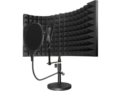 - Black microphone with removable base, black windscreen/pop filter, folding sound isolation shield