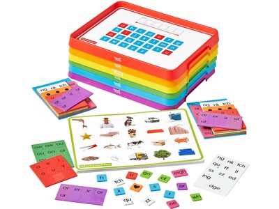 - Package contents: six magnetic dry-erase trays, 112 magnetic tiles (29 blank tiles and 83 printed letter and sound tiles), and five double-sided write-on/wipe-off mats