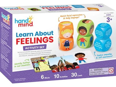 Explore feelings and practice social-emotional skills. Help children build important social-emotional skills through 10 engaging activities. The set includes two plastic question cubes, four plastic character cubes, 12 character cards, 18 situation cards, and a poster. Children match body postures and facial expressions, learn that emotions can look different on different people, and discuss how situations may cause an individual to feel a certain emotion.