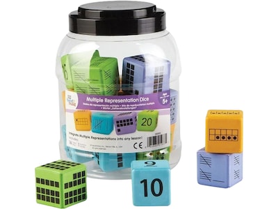 Increase student understanding of all the ways you can represent numbers with these hand2mind Multiple Representation dice, featuring multiple representations of numbers from 1 to 20. Each die represents the number in ten-frame, tally marks, base 10, and numeral format.
