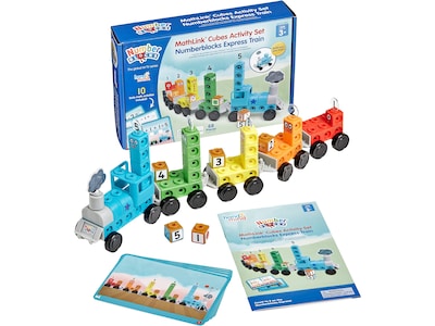 - Package contents: 21 MathLink cubes, five Numberlings, 30 train pieces, five cargo pieces, sticker sheet, five double-sided activity cards with stand, and activity guide