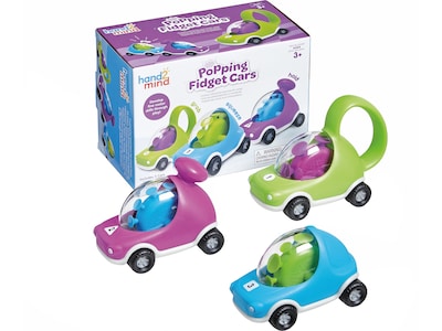 Provide calming focus and redirect children's energy with irresistible cars that pop. The hand2mind Popping Fidget Cars engage children's senses with different-sized rubber suction cups that make a satisfying popping sound when the cars are pushed and rolled across most flat horizontal surfaces. Each car encourages children to use a different grip-grab the green car, hold the purple car, and squeeze the blue car. These easy-to-grip cars are the perfect fidget tool to help children soothe anxiety, channel restlessness, and manage big feelings through calming sensory engagement. Children will learn about cause and effect and build fine motor skills with every pop as they explore sounds and movement through active play.