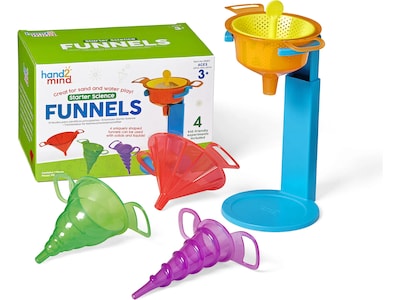Ignite scientific curiosity with the versatile hand2mind Starter Science funnel set! Children will discover endless ways to pour, mix, and sift with these durable funnels that encourage imaginative play and experimentation. Each funnel is a unique shape and size to create optical illusions and engage children in sensory play as they learn about volume, capacity, and more. An adjustable stand fits containers of different sizes and holds the funnels steady for little scientists.