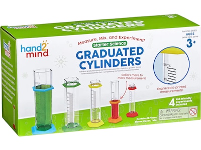 Inspire budding scientists to pour, measure, and explore with the hand2mind Starter Science graduated cylinders set! Made of clear, durable plastic, each cylinder features easy-to-read measurement marks and a sliding collar to help children accurately measure liquid levels. The cylinders rest on sturdy, colorful bases to encourage hours of sensory play and experimentation on any flat surface.