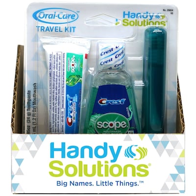 Get great oral care on-the-go with this 3 piece Handy Solutions Oral Care 3 Piece Kit. With a folding travel toothbrush, Crest Complete Toothpaste, and Scope Classic Mouthwash, you will be prepared to maintain great oral care habits when away from home.