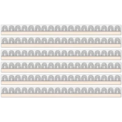- Each neutral classroom borders set includes strips of straight, white bulletin border with black rainbows and a light wood to add to any muted colors classroom theme or boho neutral classroom décor.