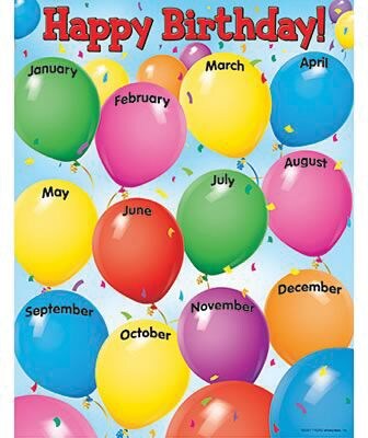 Happy birthday learning chart has a festive balloon theme with twelve months to celebrate birthdays in the classroom.
