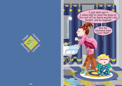 Happy Holidays - cartoon - girl brushing teeth - 7 x 10 scored for folding to 7 x 5, 25 cards w/A7 envelopes per set