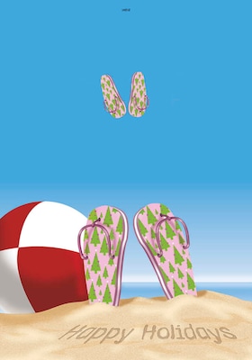 Happy Holidays - sandals , beach ball on beach - 7 x 10 scored for folding to 7 x 5, 25 cards w/A7 envelopes per set