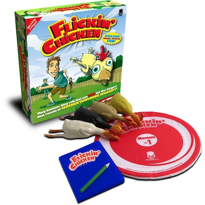 Haywire Group LateX-free flickin' chicken toss game for 2 - 4 players of age 6 and up comes with 4 rubber chickens of 8" size, a toss target, scorepad, pencil and easy-to-follow rules.