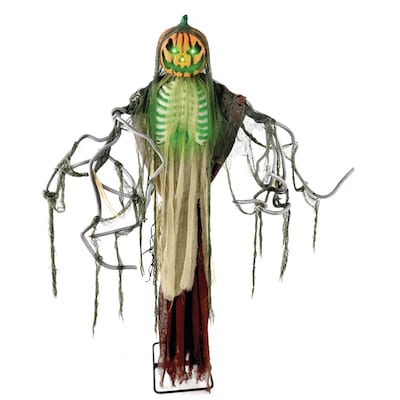 Be very afraid of Haunted Hill Farm's collection of spooky animatronics. These blood-curdling creatures are sure to terrify any trick-or-treaters, coworkers, or customers. This pumpkin man will give guests the fright of their lives with a single glance. With a touch or bump, he starts shaking while his face and chest glow in green LED lights. His 2 creepy phrases accompanied by sounds of cawing crows and mystical chimes will be sure to scare off passersby even from afar. His tattered black cloak adds a creepy twist to his appearance while his sinister facial expression brings realistic horror. Battery operated, he includes a stand and an optional hanging loop at the top of his head so you can display him however and wherever you want. Place him on the front porch to greet visitors or in your living room to complement the rest of your spooky decor. For longer prop life, we recommend indoor or sheltered outdoor use protected from inclement weather. Prepare for a jumpscare of epic proportions. For thrills and chills so frightening that your neighbors will run shrieking in horrendous delight, count on Halloween decorations from Haunted Hill Farm.