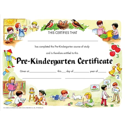 - Certificate reads: This Certifies That ______ has completed the Pre Kindergarten course of study and is therefore entitled to this Pre Kindergarten Certificate Given at _____ this ______ day of _______ year of ________
