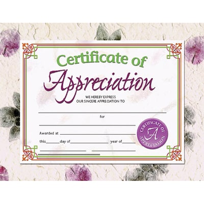 Certificates of Appreciation are a great way to thank someone for the work, service, etc. These authentic Hayes certificates are printed in full color on high quality paper. They are great to give out at award ceremonies. Certificates measure 8.5" x 11". Each pack includes 30 certificates.Certificate reads: Certificate of Appreciation We Hereby Express Our Sincere Appreciation To _____ for _____ Awarded at _____ this _____ day of _____ year of _____. These blank certificates can be personalized with the recipient's name and information regarding the certificate. They can be printed or handwritten. Downloadable template is available.