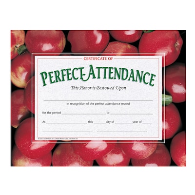 Certificate of Perfect Attendance are great for awarding students for not missing a day of school during a certain time period. They can be given out at award ceremonies and end of the year parties. These blank certificates can be handwritten or printed. We have a downloadable template available online. Each individual pack contains 30 certificates and measure 8.5" x 11". 5 packs total.