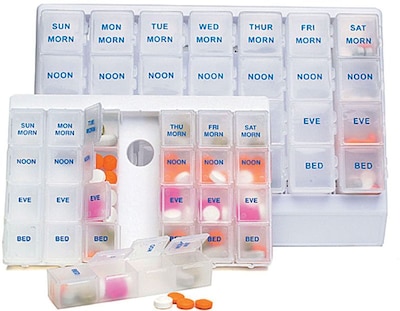 Pill boxes each of seven removable rows is marked with the day of the week and has a box for morning, noon, evening and bedtime.