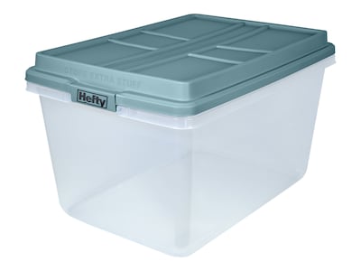 The Hefty 72 qt. container is perfect for storing a variety of items throughout the home. This clear storage container has durable latches for securing the contents inside.
